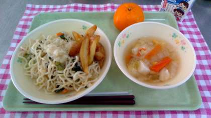 八王子産の小松菜を使い。じゃがバターものせた欲張り塩焼きそばです。
