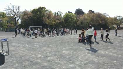 今年度楢原小は、 火曜日の給食後の全校集会を、月曜日登校後の全校朝会に変更しました。今日は、初めてなので、早めに校庭に出て、整列の位置に着いている児童が何人も並んでいました。