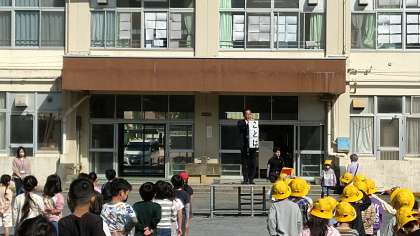 今年度第2回目の全校朝会です。月曜日の朝、子供たちは構えをもって参加している様子です。