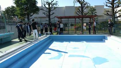 体育館での研修の後は、実際のプールで動線などを確認しました。水泳指導開始は、6月5日のの予定です。