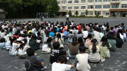 無事かどうかの確認のための校庭集合なので、避難対応のように、防災頭巾をかぶっていません。