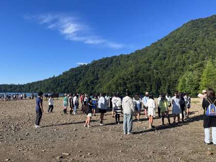 湯ノ湖畔にて、朝会を行いました。