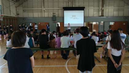 岩手県立釜石高校のの防災・伝承団体「夢団」の皆さんの講習を中心にわくわく防災教室が進んでいきます。