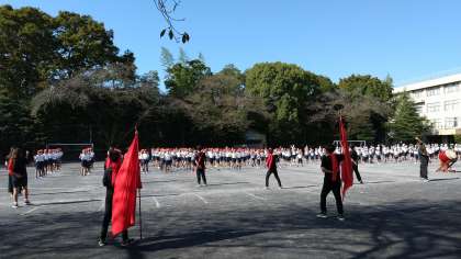 応援合戦の練習をすると、赤も白も頑張ります。声が校庭で響いていました。