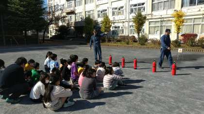 消防士さんたちが、3年生はのために指導にきてくださいました。初期消火体験学習には、大声で火事を知らせるところから始まります。