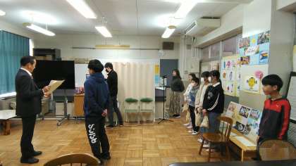 標語入選の5・6年生4名、プログラミングコンテストの6年生1名が終わると、先生チームがバレーボールとバドミントンで八王子市準優勝と3位になったのを表彰しました。代表の沼田先生が、受け取りました。