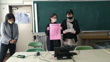 3月初めの全校朝会なので、代表委員会から生活目標についての呼びかけがありました。3月の目標は、「レッツチャレンジ!新学年に向けてじゅんびをしよう!」です。二人とも中学生に向けて、今何をがんばるかを語ってくれました。