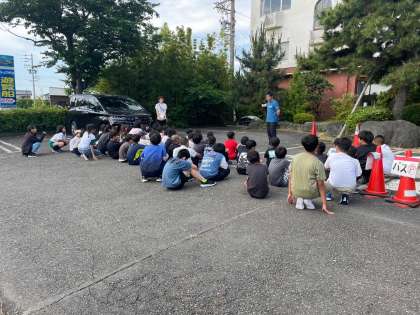 2日目の朝です。玄関前に集合しました。海の近くで朝の会をするため、これから移動します。