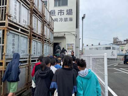 魚市場で働いている方のお話を聞いています。冷凍庫の中に入れるので、防寒用の上着を着て準備しています。