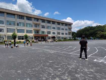 学年が上がるにしたがって、遠くまで投げられるので先生の立つ位置は下がります。