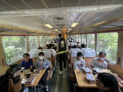 列車のレストラン清流で、車窓から自然の景色を楽しみながら昼食をとります。
