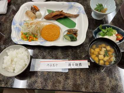 ニジマスのからあげ、煮物、チーズチキンカツやお吸い物などのメニューをいただきました。ごはんやお吸い物をおかわりする子がたくさんいました。
