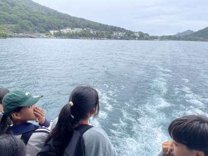 遊覧船の2階席から見える景色を楽しんでいます。