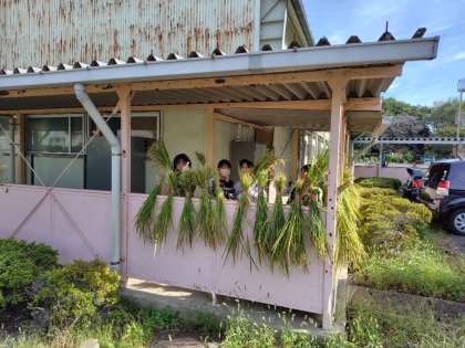体育館通路の軒下では、奥から稲の束が干されていました。5年生は、「楢原小米」に満足そうでした。