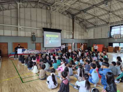 渡辺先生が用意してくださった12ものコーナーで、楢原小体育館は動物園体験ができるようになりました。どんな体験ができるかの、お話を聞きました。