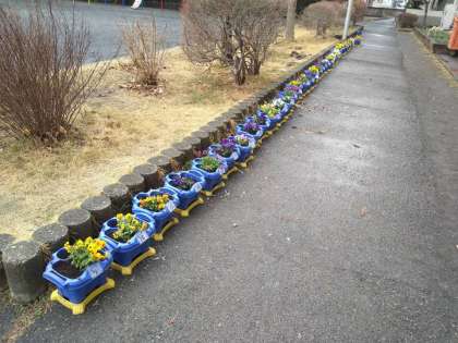 進級前に春を迎える準備として、2年生がビオラを1年生がパンジーを鉢に植えました。明るく春らしい雰囲気になります。