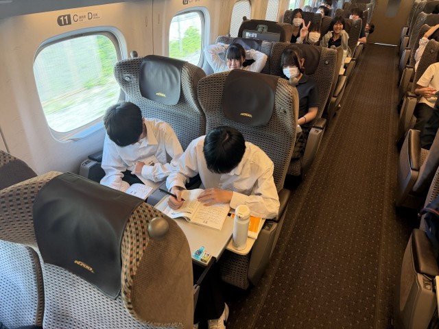 新幹線車内では、生徒たちは楽しく会話したり、必死に勉強している生徒も。