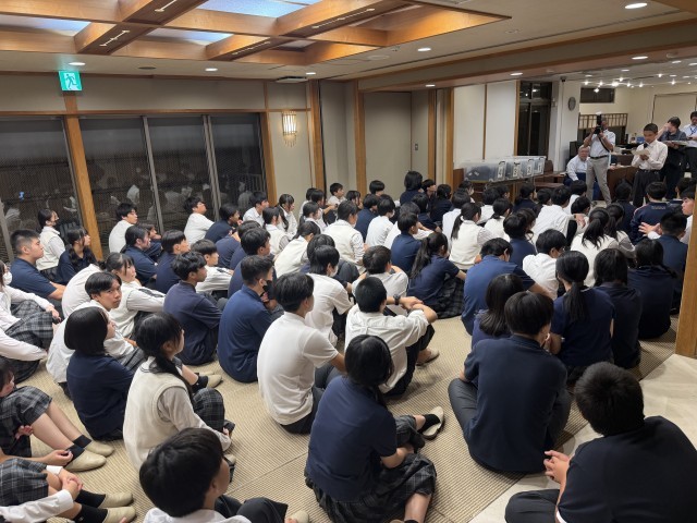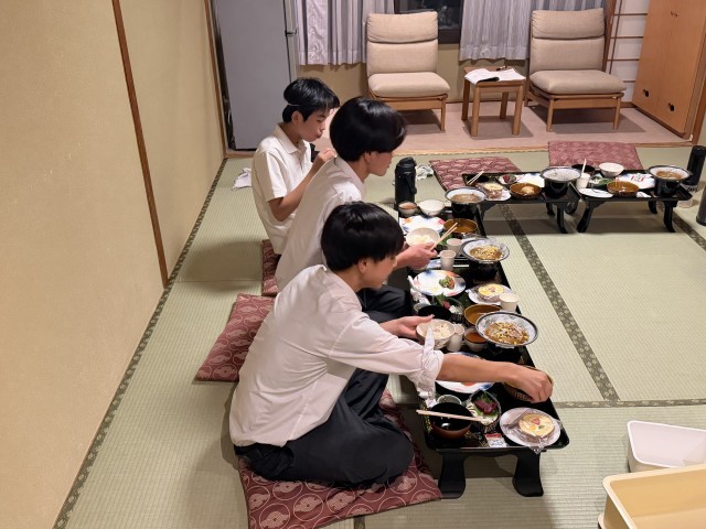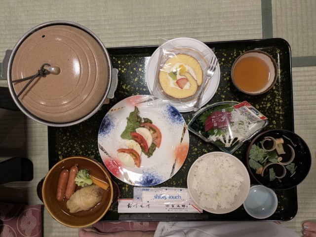 今日の夕食はご飯、お吸い物、カルビ焼肉、お造り、ロールキャベツ、カリブ海風モッツァレラチーズとトマトのサラダ、フルーツロールケーキです。