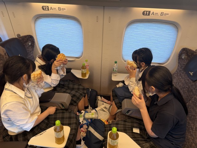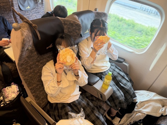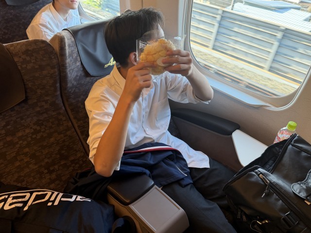 新幹線では軽食のメロンパンとペットボトルのお茶が配布されています。
