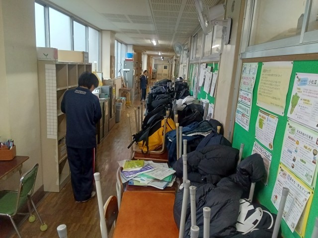 学期も残すところあと1日 今日は大掃除です。各クラス 協力し、普段の清掃 より 念入りによごれをきれいに落としています。