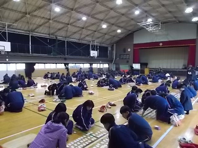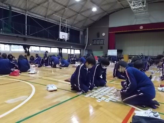 体育館にて百人一首を行いました。グループに分かれて集中して取り組む姿が見られました。