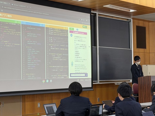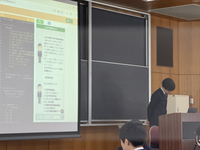 3年生の技術の授業でプログラミング教育の一貫として行っている、チャットボットのプログラミングを競技形式でプログラム制作、プレゼン発表をしました。