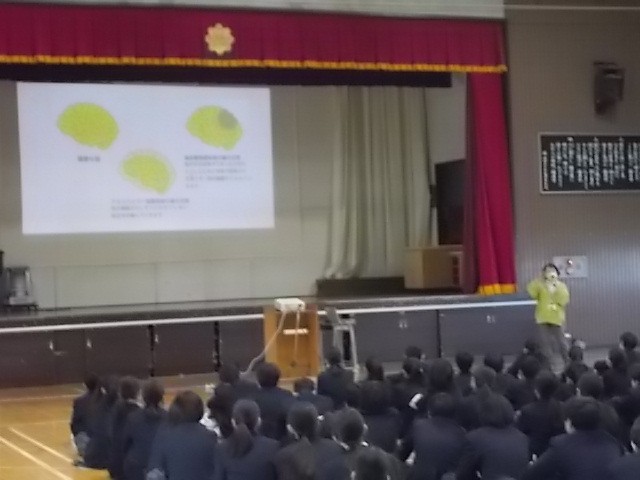 高齢者あんしん相談センター所員の方や施設利用者さんをお招きし、認知症についての説明をしていただきました。生徒は認知症に対する偏見や誤解をなくし、相手の立場に立って考えることの大切さや、困っている高齢者に対してどのように声をかけるべきかについて学ぶことができました。