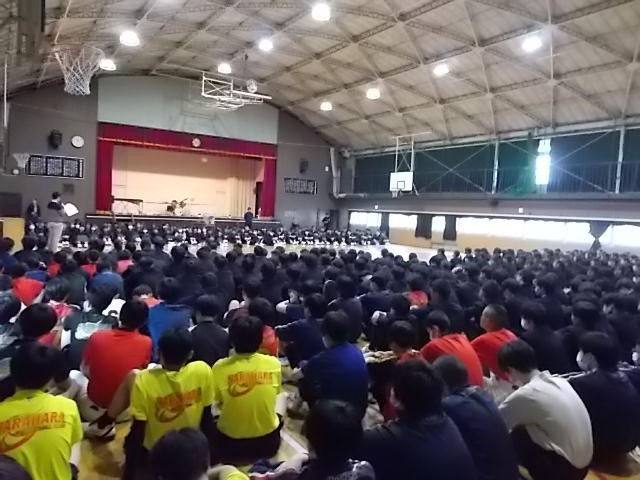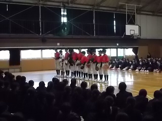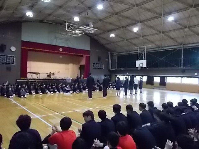 体育館で新入生歓迎会を行いました。1年生に向けて上級生が委員会活動や部活動について説明をしました。部活動紹介では各部活動が元気よくパフォーマンスしました。