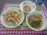 ごはん四川豆腐きのこスープポップビーンズ牛乳今日のきのこスープの中に、生しいたけ...