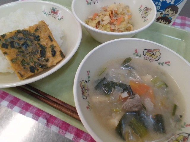 出来た酒粕を給食で使い、「粕汁」にしていただきます。粕汁とは酒粕を加えて野菜を煮た汁物です。