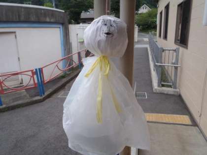 大きな照る照る坊主が、学童さんの前に吊るしてありました。