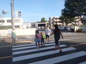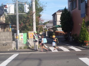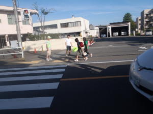 写真上:中小田野交差点付近。学校安全ボランティアの方達が見守ってくださっていました。