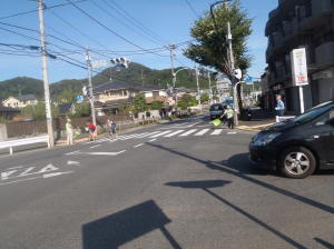 写真下:かわさきクリニック前。たくさんの恩中生が、自転車で登校するところでした。田倉駐在さんも、児童の安全を見守ってくださいました。
