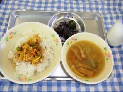 今日のこんだては、かき揚げ丼・ご汁・浅漬け・牛乳です。