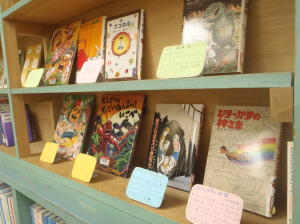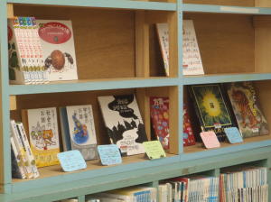 図書室の後ろの棚は、今まで置いてあった本を下の段に大移動して、目立つ位置に本を飾りました。