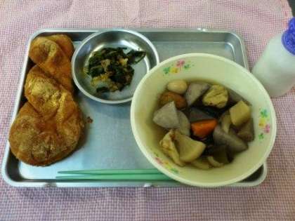 9日のこんだては、きな粉揚げパン・おでん・おかか和え・牛乳でした。