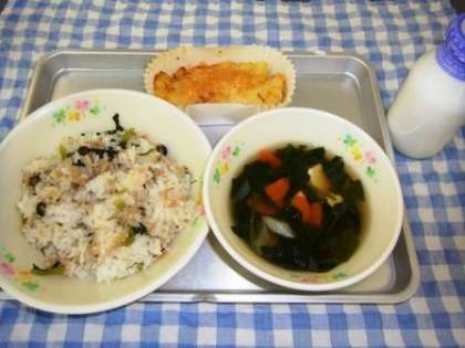 今日のこんだては、ツナときのこのごはん・ポテトのチーズ焼き・ほうれん草のスープ・牛乳です。