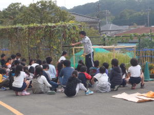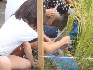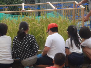 今年はバケツ稲ではなく、学級花壇にブルーシートを敷いて水田を作りました。
