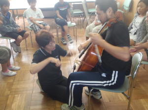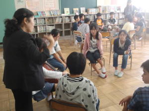 恥ずかしがり、しり込みする児童を前に、率先して体験活動をしていました。
