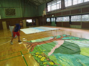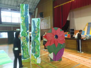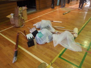 舞台の下や奥、体育館裏の倉庫から、学芸会に関する小道具・大道具・衣装などを出して、今年の学芸会でつかえそうなものをみつくろっていました。