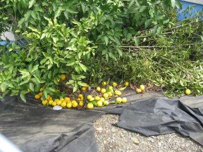 体育館の裏のゆずの木も、木の周りの雑草よけシートも、新しくできたばかりの校庭北側農園のシートも、激しい風で、大変なことになっていました。