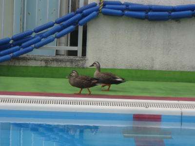 プール開きも済んだ恩一小の大プールに、鴨が来ました。