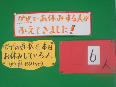 また、「かぜの症状で、本日お休みしている人」の掲示も出ました。(写真下)