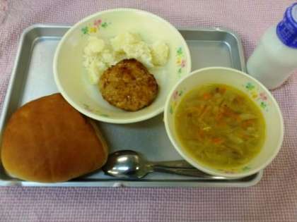 今日のこんだては、サンドパン・れんこんハンバーグ・粉ふきいも・ジュリエンヌスープ・牛乳です。