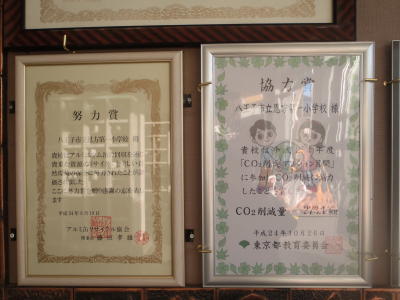 朝会で紹介した表彰状を額に入れ、西昇降口に掲出しました。