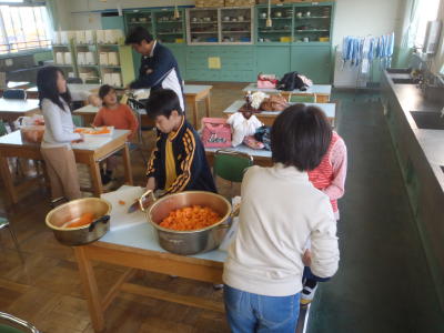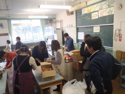 PTA行事の前日準備。家庭科室にお邪魔すると、作業の真っ最中。(写真上)