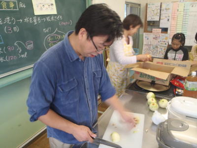 福富PTA副会長も、料理の腕をふるいました。素晴らしい包丁さばきでした。(写真下)