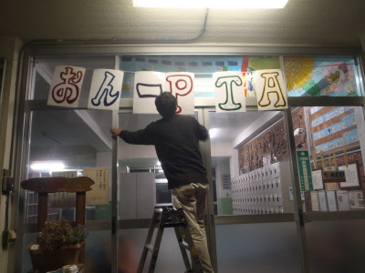 蓑輪PTA会長お手製の看板を、西昇降口と体育館に飾り付けました。