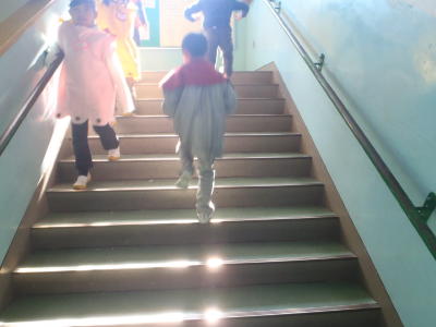 14日は練習の大詰め。階段ではお地蔵様が歩き、体育館には忍者が走り込んでいきました。(写真上・中)