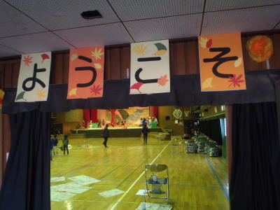 正門前に飾られる立て看板(写真上:写真では横に倒されていて横看板になっていますが)や、体育館の入り口の看板(表示)(写真中)も取り付けられ、いよいよ学芸会ムードが高まっています。